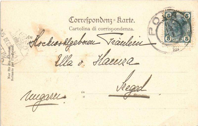 Leírás: 1905 Pola, Pula; Arena / amphitheatre, port, "Liburnia" steamship. Dep. M. Clapis (fl)