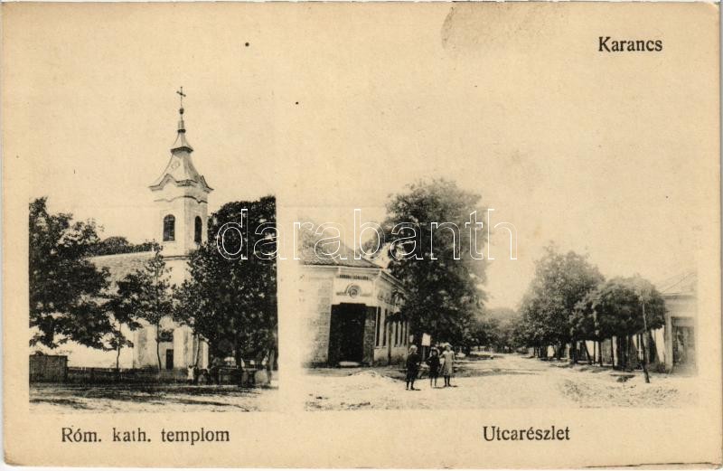 Leírás: Karancs, Karanac; Római katolikus templom, utca, Korona szálloda, üzlet / church, street, hotel, shop