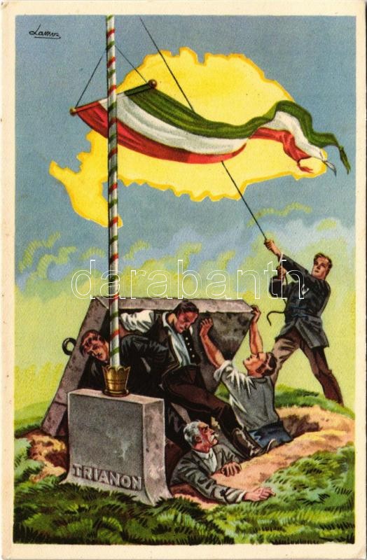 Leírás: Trianon. Hátoldalon térkép. Ereklyés Országzászló Nagybizottság / Hungarian irredenta s: Lamoss