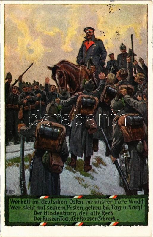 1916 Wer hält im deutschen Osten vor unsrer Türe Wacht... / WWI German military art postcard, patriotic propaganda, Field Marshal Hindenburg s: P. Hey (EK)