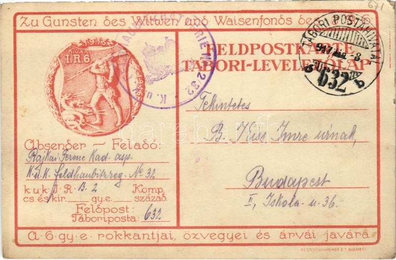 1917 K.u.K. I.R. 6. Zu Gunsten des Witwen und Waisenfonds des I.R. 6. / A 6. gyalogezred rokkantjai, özvegyei és árvái javára / WWI Austro-Hungarian K.u.K. military, 6th Infantry Regiment charity fund (EK)