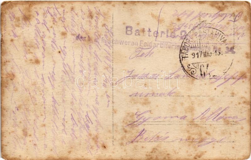 Leírás: 1917 Osztrák-magyar katonák csoportja, tábori konyha / Austro-Hungarian K.u.K. military, group of soldiers, field kitchen. photo + "Batterie 2. des k.u.k. schweren Feldartillerieregiments No. 34." (szakadás / tear)