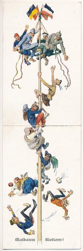 Maibaum-Klettern! / Központi hatalmak katonái májusfa tetején. Első világháborús antanthatalmak ellenes gúnyos propaganda. Kinyitható képeslap / Central powers on top of a May tree (maypole). WWI anti-Entente Powers military mocking propaganda, folding postcard. M. Munk Vienne Nr. 1085. s: Th. Zasche