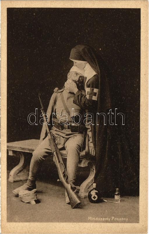 Sebesült osztrák-magyar katona Vöröskeresztes ápolónővel / WWI Austro-Hungarian K.u.K. military, injured soldier with Red Cross nurse. Mindszenty (Pozsony) + "Vörös kereszt vármegyei választmánya Pozsony" (EK)