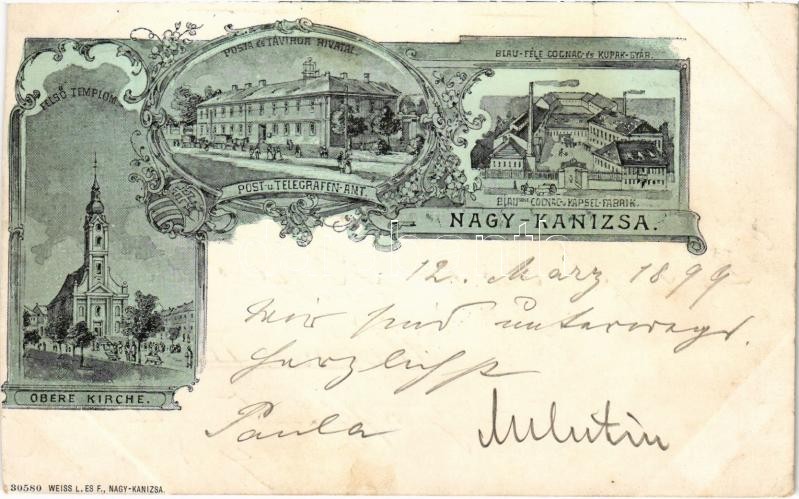 1899 (Vorläufer) Nagykanizsa, Obere Kirche, Post und Telegrafen-Amt, Cognac- und Kapsel-Fabrik / Felső templom, Posta és távirda hivatal, Blau-féle konyak- és kupakgyár. Weiss L. és F. Art Nouveau, floral (vágott / cut)
