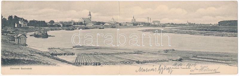 Leírás: 1906 Szolnok, Tisza part, faúsztatás, templomok, zsinagóga. Két részes kinyitható panorámalap