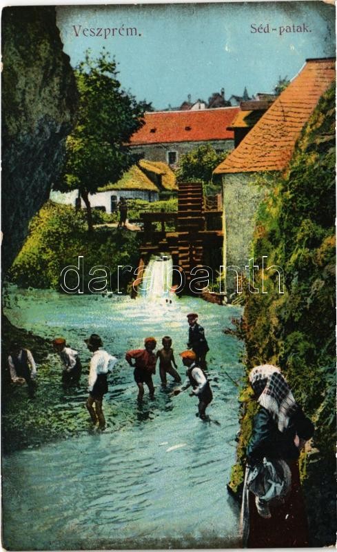 1914 Veszprém, Séd patak, fürdőzők. Kálmán István kiadása (EK) https://www.darabanth.com/hu/423-Gyorsarveres/423.0/Kepeslapok/Magyarorszag~1500004/1914-Veszprem-Sed-patak-furdozok-Kalman-Istvan-kiadasa-EK~II2691190
