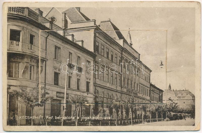 1932 Kecskemét, Református bérpalota, jogakadémia, Hitelszövetkezet, Kultura könyvnyomda. leporellolap 10 kis képpel köztük a mozi, múzeum és vasútállomás (EB)
