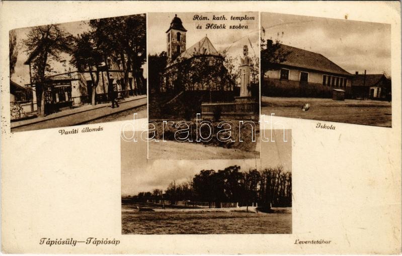 Leírás: 1939 Tápiósüly, Tápiósüly-Tápiósáp (Sülysáp); vasútállomás, Római katolikus templom, Hősök szobra, emlékmű, Iskola, Leventetábor (EK)