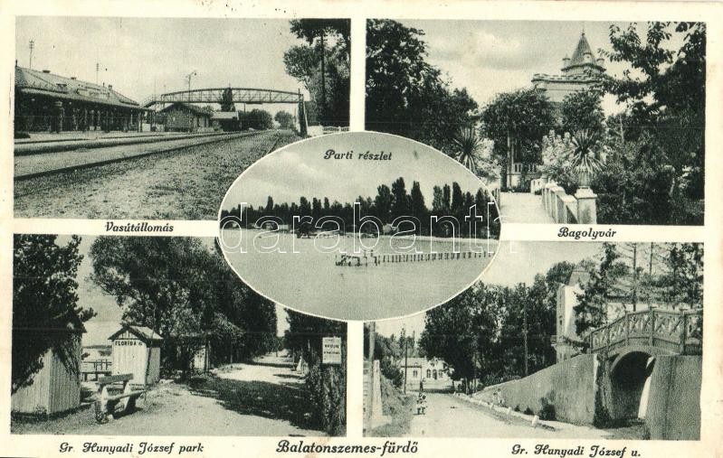 Leírás: Balatonszemes-fürdő, vasútállomás, Gr. Hunyadi József park és utca, Bagolyvár, part