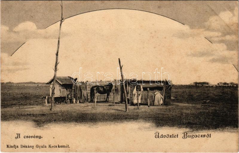 Leírás: Bugac (Kecskemét), cserény, magyar folklór. Dékány Gyula kiadása (ázott / wet damage)