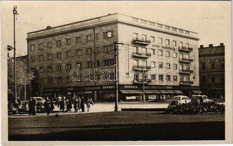 Debrecen, Alföldi takarékpénztár palotája, Szilágyi Sándor cserkészbolt, Erdődy Zoltán órás és ékszerész, Stühmer cukorka, Schön Sándor, Dermata, Hamerli J. Rózsa nőidivat, Espresso, Tóthfalussy, fodrászat üzlete, autók