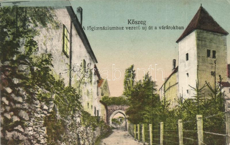 Leírás: Kőszeg, A főgimnáziumhoz vezető új út a várárokban. Róth Jenő kiadása (EK)