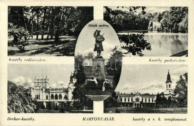 Martonvásár, Hősök szobra, Dreher kastély, római katolikus templom https://www.darabanth.com/hu/423-Gyorsarveres/423.0/Kepeslapok/Magyarorszag~1500004/Martonvasar-Hosok-szobra-Dreher-kastely-romai-katolikus-templom~II1720618