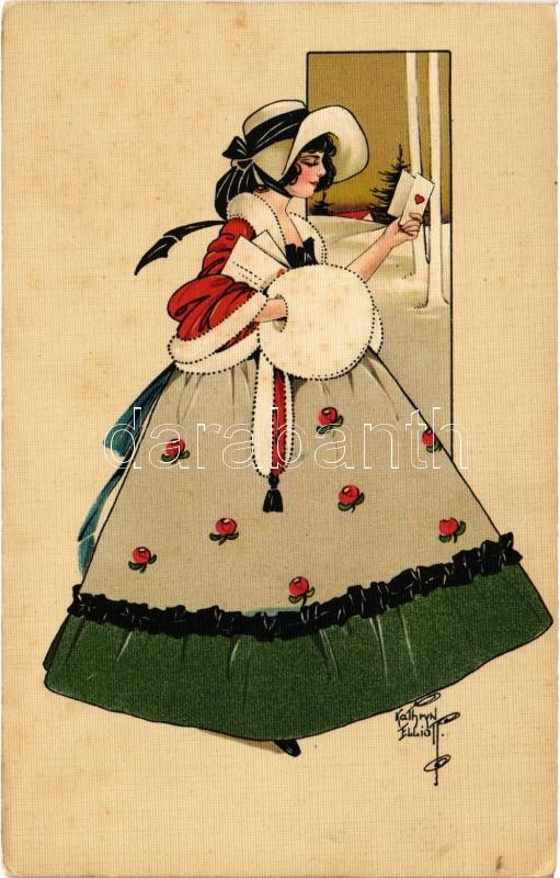 Lady art postcard. G.O.M. 1986. litho s: Kathryn Elliott (fl) https://www.darabanth.com/hu/423-Gyorsarveres/423.0/Kepeslapok/Muveszlapok~1500080/Lady-art-postcard-GOM-1986-litho-s-Kathryn-Elliott-fl~II2691098