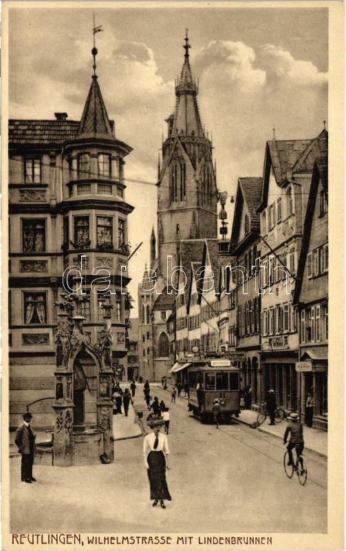 Leírás: 1918 Reutlingen, Wilhelmstrasse mit Lindenbrunnen / street view, tram, bicycle