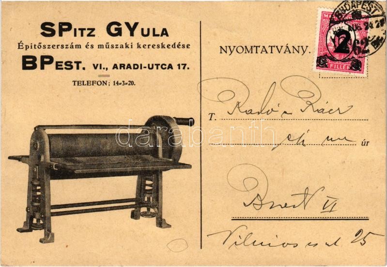 1932 Spitz Gyula építőszerszám és műszaki kereskedése. Kézi mángorló. ... https://www.darabanth.com/hu/423-Gyorsarveres/423.0/Kepeslapok/Reklam~1500083/1932-Spitz-Gyula-epitoszerszam-es-muszaki-kereskedese-Kezi-mangorlo-Budapest-VI-Aradi-u~II2693768