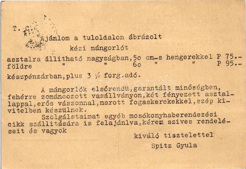 Leírás: 1932 Spitz Gyula építőszerszám és műszaki kereskedése. Kézi mángorló. Budapest VI. Aradi utca 17.