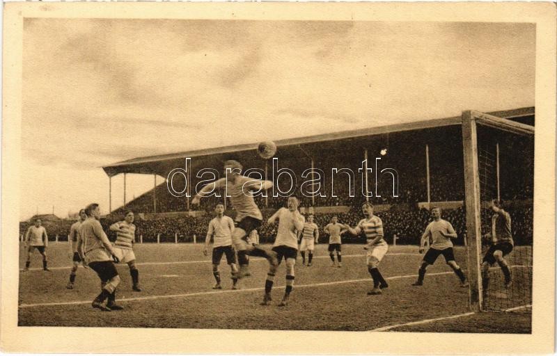 1913 március 16. FTC-MTK labdarúgó mérkőzés. Corner helyzet, Bíró Gyuszi gyönyörű fejessel véd. Kiadja a 'Klasszikus pillanatok vállalata' 7. sz. / Hungarian football match