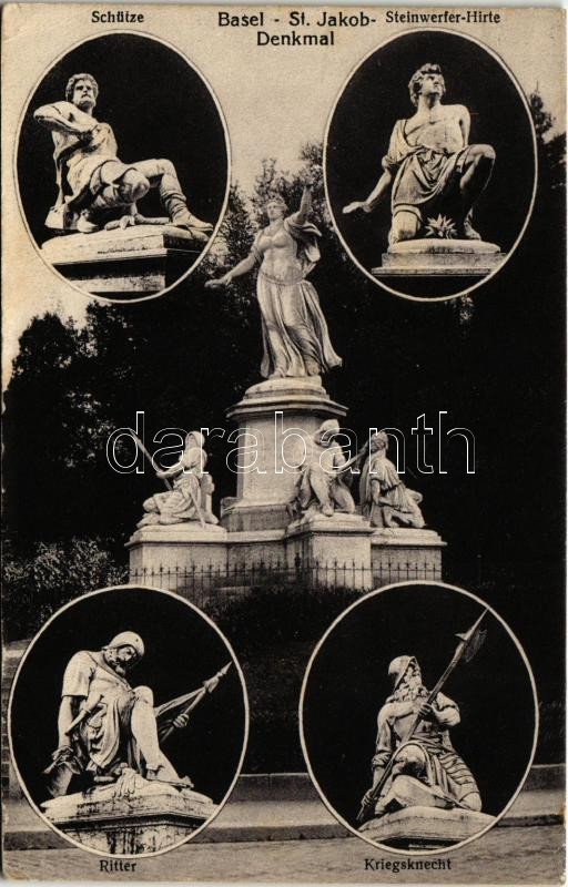 Leírás: 1922 Basel, St. Jakob-Denkmal. Schütze, Steinwerfer-Hirte, Ritter, Kriegsknecht / monument (EK)