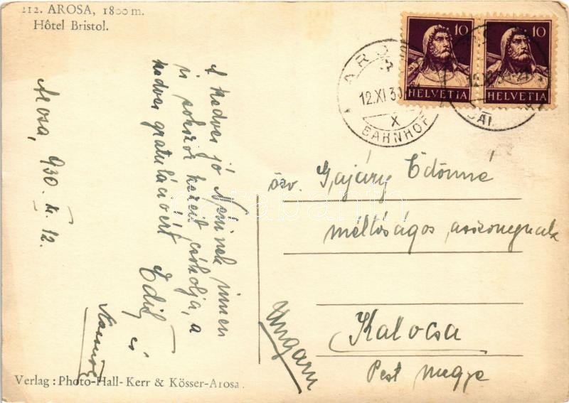 1930 Arosa, Hotel Bristol (EK) https://www.darabanth.com/hu/423-Gyorsarveres/423.0/Kepeslapok/Svajc~1500049/1930-Arosa-Hotel-Bristol-EK~II2689813