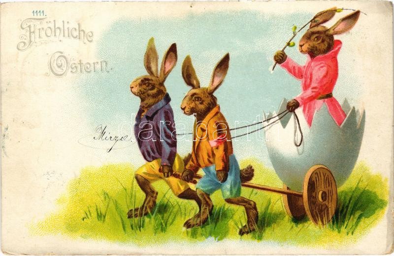 Leírás: 1900 Fröhliche Ostern / Easter greeting art postcard with rabbits and egg carriage. litho (lyuk / pinhole)