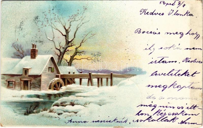 1900 Litho greeting card with watermill in winter (EK) https://www.darabanth.com/hu/423-Gyorsarveres/423.0/Kepeslapok/Udvozlolapok-Unnepek~1500093/1900-Litho-greeting-card-with-watermill-in-winter-EK~II2686536