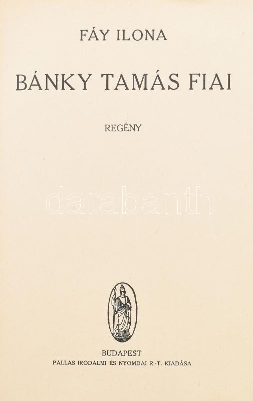 Fáy Ilona: Bánky Tamás fiai. Bp., [1928], Pallas, 186+(6) p. Egyetlen ... https://www.darabanth.com/hu/423-Gyorsarveres/423.0/Konyvek/Konyvek-Egyeb-ritkasagok~2000023/Fay-Ilona-Banky-Tamas-fiai-Bp-1928-Pallas-186plus6-p-Egyetlen-kiadas-Atkotott-egesz~II2690279