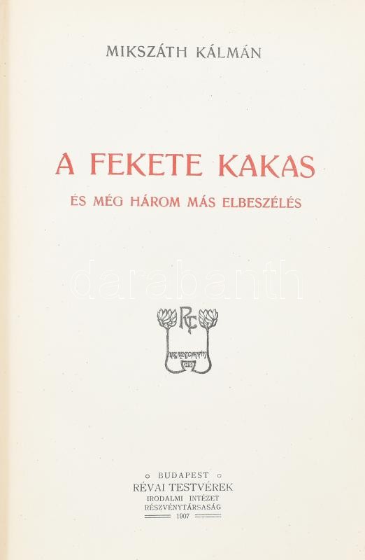 Mikszáth Kálmán: A fekete kakas és még három más elbeszélés. Bp.,1907, Révai,(Légrády-ny.), 4+278+1 p. Kiadói aranyozott, festett egészvászon-kötés, Gottermayer-kötés, festett lapélekkel, a borítón kopásnyomokkal, a gerinc felső részén kis sérüléssel.