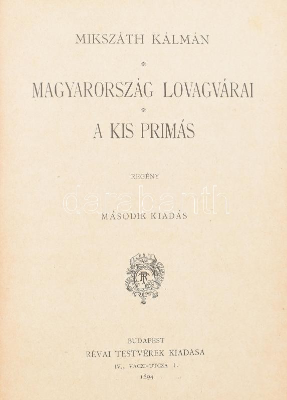 Mikszáth Kálmán: Magyarország lovagvárai. A kis prímás. Bp.,1894, Révai,(Pallas-ny.), 8+253+1 p. Második kiadás. Kiadói aranyozott, festett egészvászon-kötés, Gottermayer-kötés, festett lapélekkel, a borítón kopásnyomokkal.