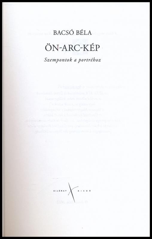 Leírás: Bacsó Béla: Ön-arc-kép. Szempontok a portréhoz. Bp., 2012., Kijárat.