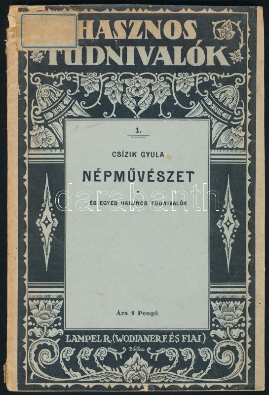 Csízik Gyula: Népművészet és egyéb hasznos tudnivalók. Hasznos Tudnivalók. Bp., én., Lampel R. (Wodianer F. és Fiai) Rt., 99 p. Kiadói papírkötés, foltos, sérült gerinccel,