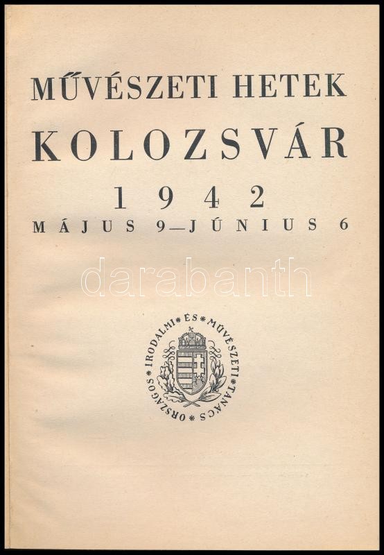 Művészeti hetek Kolozsvár 1942 május 9-június 6. Budapest, 1942, Országos Irodalmi és Művészeti Tanács, 164 p.+12 t. Fekete-fehér képekkel és ábrákkal, többek közt Barabás Miklós, Fadrusz János, Hollósy Simon, Thorma János műveinek reprodukcióival illusztrált. Kiadói félvászon kötés, kissé kopott borítóval.