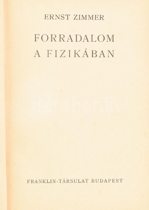 Zimmer, Ernst: Forradalom a fizikában. Ford.: Szarvas Pál. A Búvár Könyvei XIII. Bp., [1942], Franklin-Társulat. Egyetlen kiadás. Egészoldalas fekete-fehér képekkel, szövegközi ábrákkal illusztrálva. Kiadói félvászon-kötés.