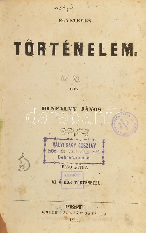 Hunfalvy János: Egyetemes történelem. I-II. köt. (Egybekötve). I.: Az ó kor történetei. II.: A közép kor történetei. Pest, 1851, Emich Gusztáv, VI+(2)+345+(3) p., (2)+225+(3) p. Egészvászon-kötésben, festett lapélekkel, helyenként foltos lapokkal, intézményi bélyegzőkkel, volt könyvtári példány.