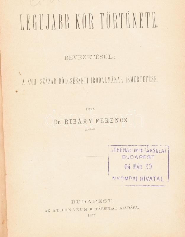 Ribáry Ferenc: A legújabb kor története. Bevezetésül: A XVIII. század bölcsészeti irodalmának ismertetése. Bp., 1877, Athenaeum, 312+(4) p. Átkötött félvászon-kötésben, több kijáró lappal, ex libris-szel, a kiadó bélyegzőjével.