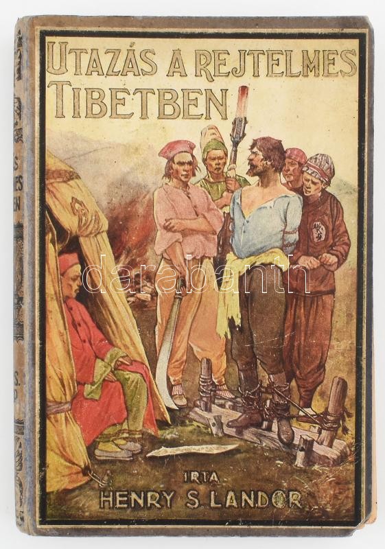 Henry S. Landor: Utazás a rejtelmes Tibetben. Átdolgozta: Tábori Kornél. Bp., [1927], Tolnai, 315+(2) p. Szövegközi és egészoldalas illusztrációkkal. Kiadói illusztrált kartonált papírkötés, kopottas, kissé sérült borítóval, foltos lapokkal.