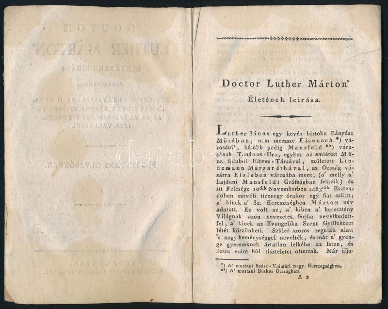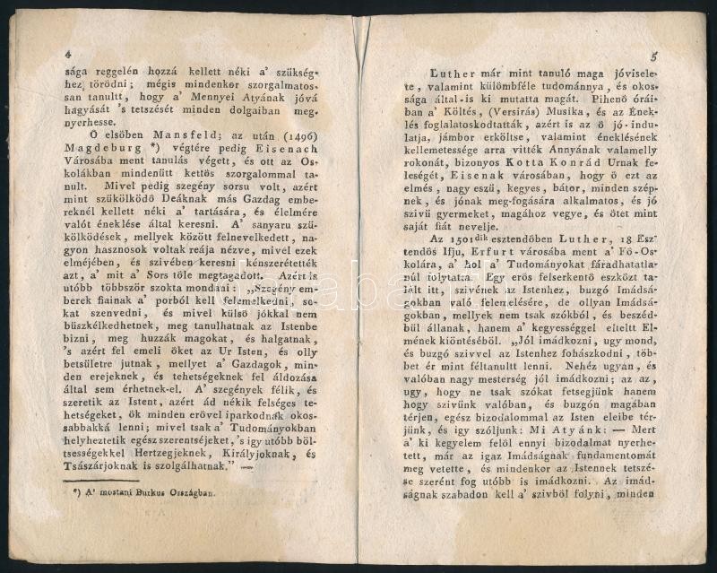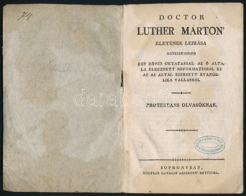 cca 1820 után Doctor Luther Márton' életének leírása. Egyszer'smind egy rövid oktatással az ő általa elkezdett reformatióról és az az által szerzett evangelika vallásról. Protestans olvasóknak. Soprony, én., Kultsár Katalin Asszony' betűivel, 46 p. Korabeli papírkötés, régi intézményi bélyegzővel, a gerincen címkével.