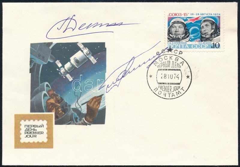 Gennagyij Szarafanov (1942-2005) és Lev Gyomin (1926-1998) szovjet űrhajósok aláírásai emlékborítékon / Signatures of Gennadiy Sarafanov (1942-2005) and Lev Dyomin (1926-1998) Soviet astronauts on envelope