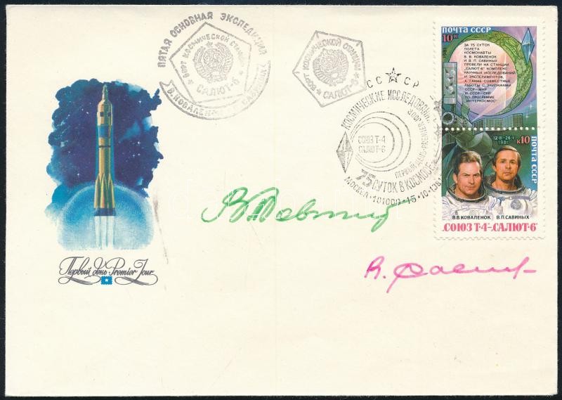 Vlagyimir Kovaljonok (1942- ), Viktor Szavinih (1940- ) szovjet űrhajósok aláírásai emlékborítékon / Signatures of Vladimir Kovalyonok (1942- ), Viktor Savinykh (1940- ) Soviet astronauts on envelope