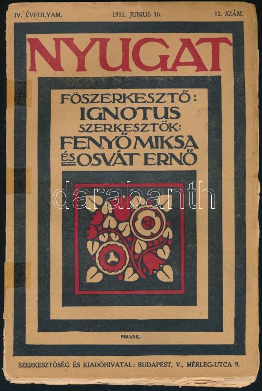 1911 A Nyugat c. folyóirat IV. évf 12.száma. Borító szakadt https://www.darabanth.com/hu/423-Gyorsarveres/423.0/Mutargy-papirregiseg-egyeb/Nyomtatvanyok~2000002/1911-A-Nyugat-c-folyoirat-IV-evf-12szama-Borito-szakadt~II2692931