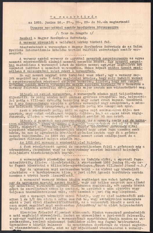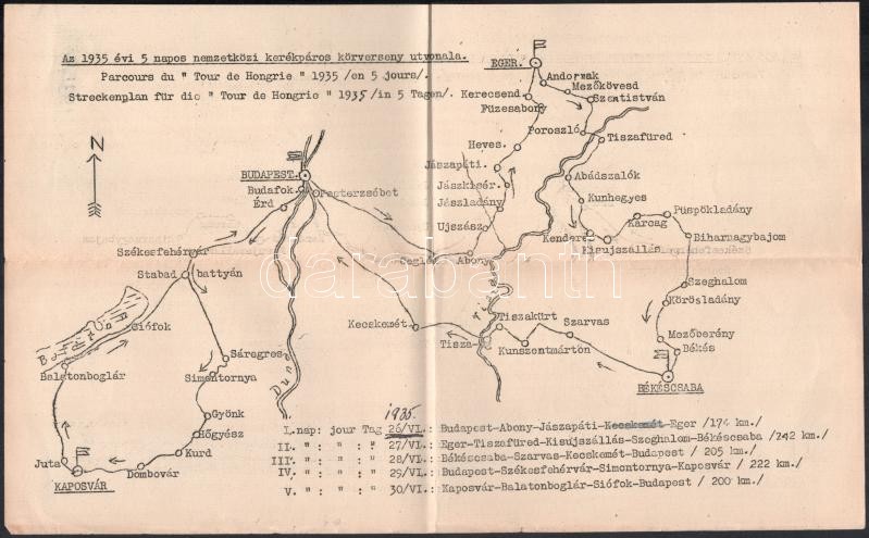 1935 Ötnapos kerékpáros körverseny programja és térképe 2 lapon https://www.darabanth.com/hu/423-Gyorsarveres/423.0/Mutargy-papirregiseg-egyeb/Nyomtatvanyok~2000002/1935-Otnapos-kerekparos-korverseny-programja-es-terkepe-2-lapon~II2693902