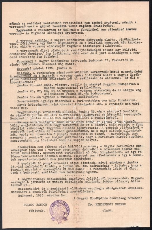 Leírás: 1935 Ötnapos kerékpáros körverseny programja és térképe 2 lapon