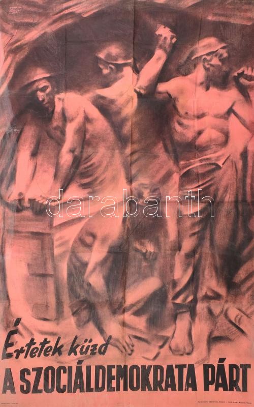 1945 Értetek küzd a Szociáldemokrata Párt, politikai propaganda plakát, "Meunier után Mácsai 945" jelzéssel a plakáton, felelős kiadó: Justus Pál, Forrás-nyomda mélynyomása, hajtásnyomokkal, apró sérülésekkel, 86x56 cm