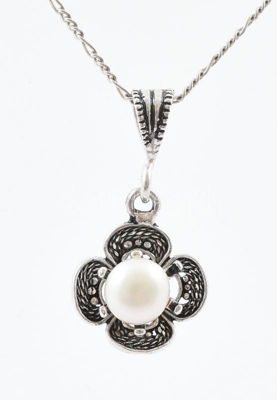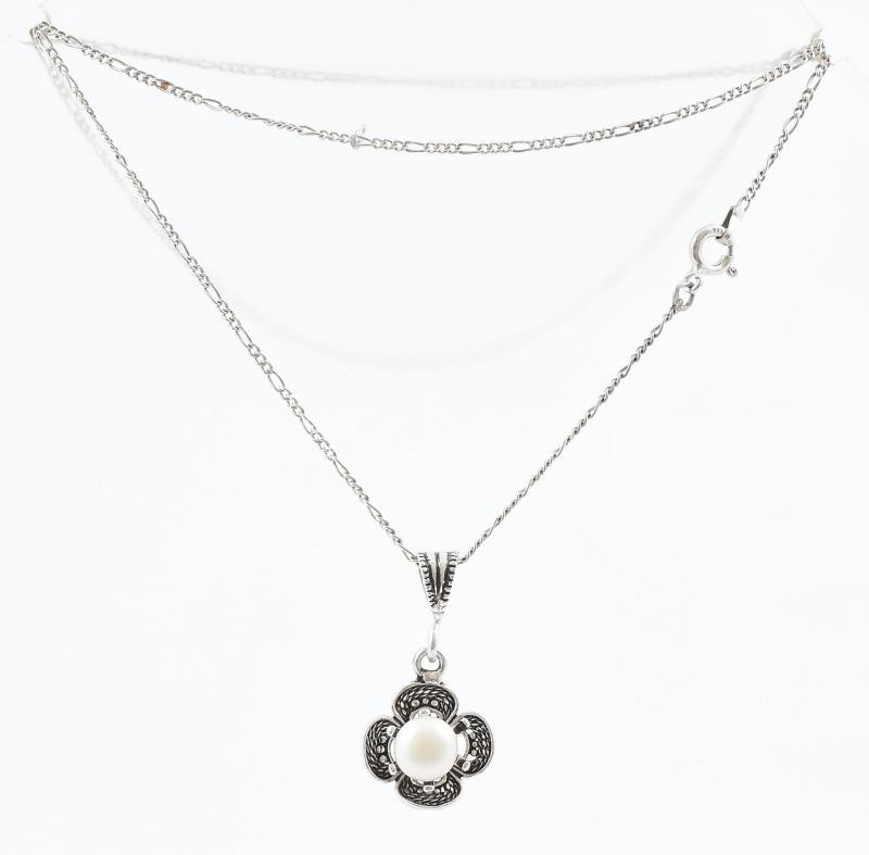 Leírás: Ezüst (Ag) lánc tenyésztett gyöngy medállal, jelzett, bruttó: 5g, h: 51 cm