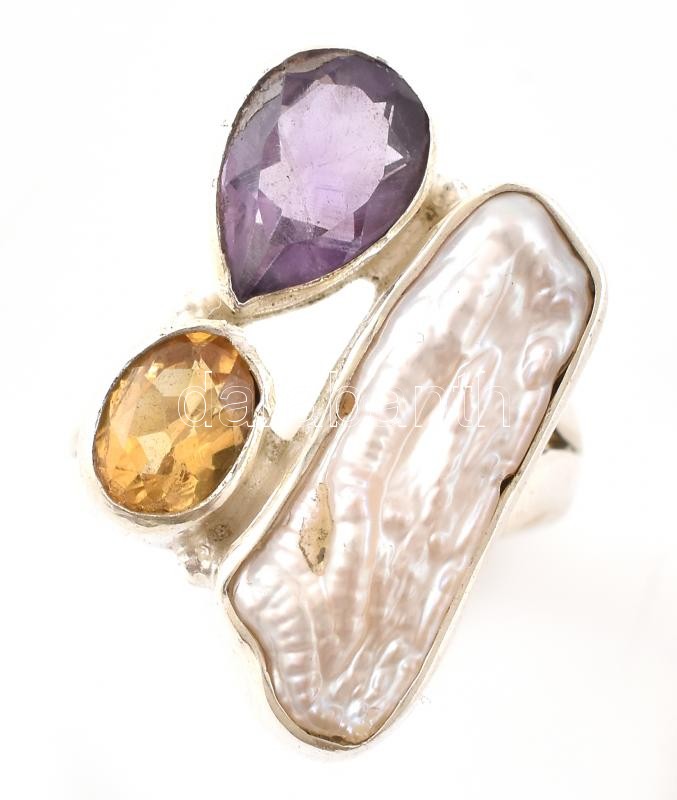 Ezüst(Ag) gyűrű gyöngyház, citrin és ametiszt díszítéssel, jelzett, mé... https://www.darabanth.com/hu/423-Gyorsarveres/423.0/Nemesfem-disztargyak-ekszerek-dragakovek/Nemesfem-disztargyak-ekszerek-dragakovek~2000024/EzustAg-gyuru-gyongyhaz-citrin-es-ametiszt-diszitessel-jelzett-meret-53-brutto-7-~II2669591