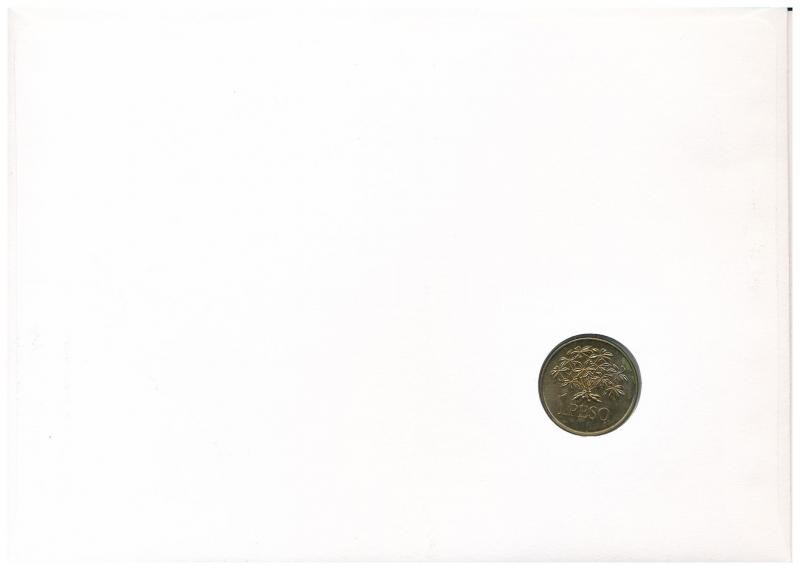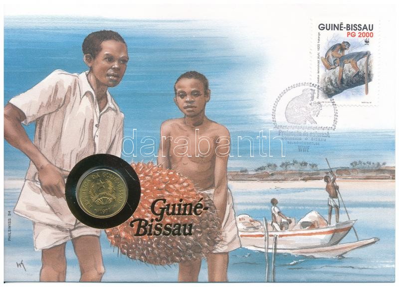 Bissau-Guinea 1977. 1P Al-Br felbélyegzett borítékban, bélyegzéssel, német nyelvű tájékoztatóval T:1- patina Bissau-Guinea 1977. 1 Peso Al-Br in envelope with stamp, cancellation and a prospectus in german C:AU patina