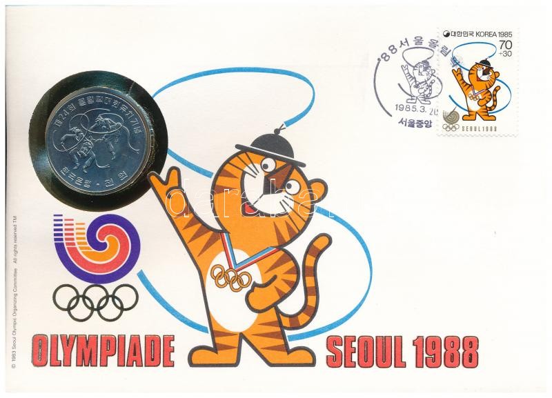 South Korea 1982. 1000 Won Cu-Ni "Olympic Games 1988 in Seoul" in coin envelope with stamps and cancellations, with german language information sheet C:UNC Krause KM#28