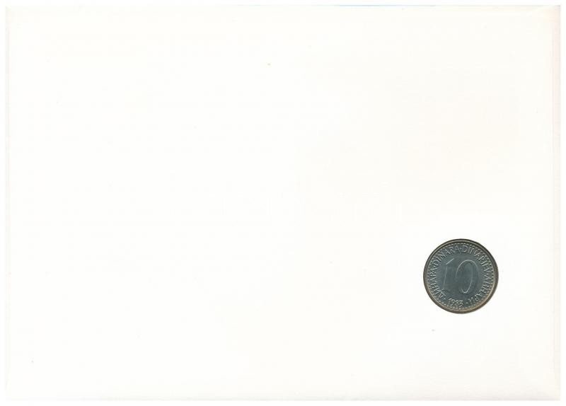 Jugoszlávia 1983. 10D Cu-Ni felbélyegzett borítékban, bélyegzéssel, német nyelvű tájékoztatóval T:1- kis patina, karc Yugoslavia 1983. 10 Dinara Cu-Ni in envelope with stamp, cancellation and a prospectus in german C:AU small patina, scratch