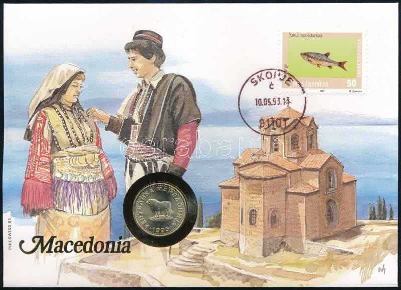 Macedónia 1993. 1D Cu-Ni felbélyegzett borítékban, bélyegzéssel, német nyelvű tájékoztatóval T:1-
